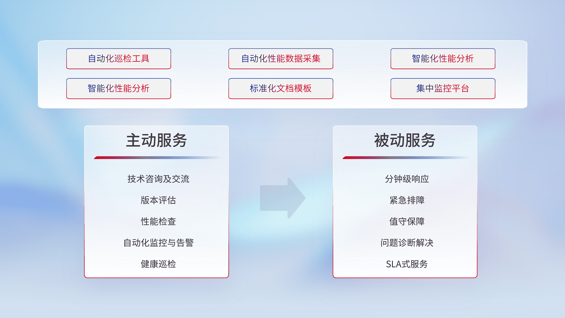 智能化工具和标准化文档,,,保障服务质量,,,提供主动服务(包含技术咨询、、版本评估、、、、性能检查、、、、自动化监控与告警、、健康巡检)和被动服务包含(分钟级响应、、、、紧急排障、、、、值守保障、、、、问题诊断解决、、、、SLA服务)。。。